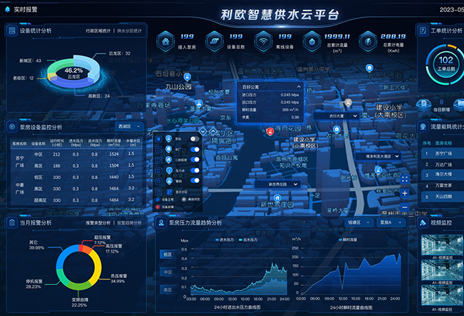 綜合設(shè)備運行狀態(tài)、實時數(shù)據(jù)、門禁開關(guān)、圖像監(jiān)控,紅外監(jiān)測與高清視頻聯(lián)動,來人自動抓拍,遠程報警,保障水質(zhì)安全、設(shè)備安全以及泵房環(huán)境安全;